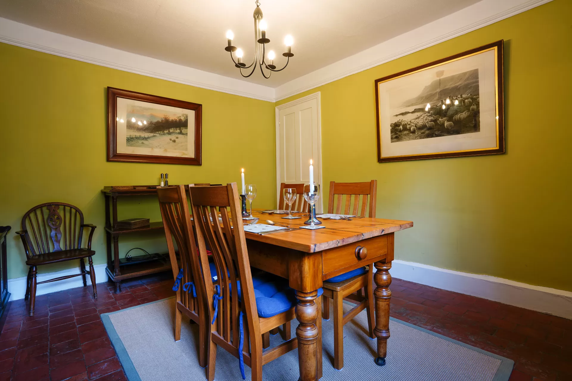 The dining room retains its original quarry-tiled floor and features a second wood-burning stove, known as the ‘Clock’ stove, perfect for lingering meals.