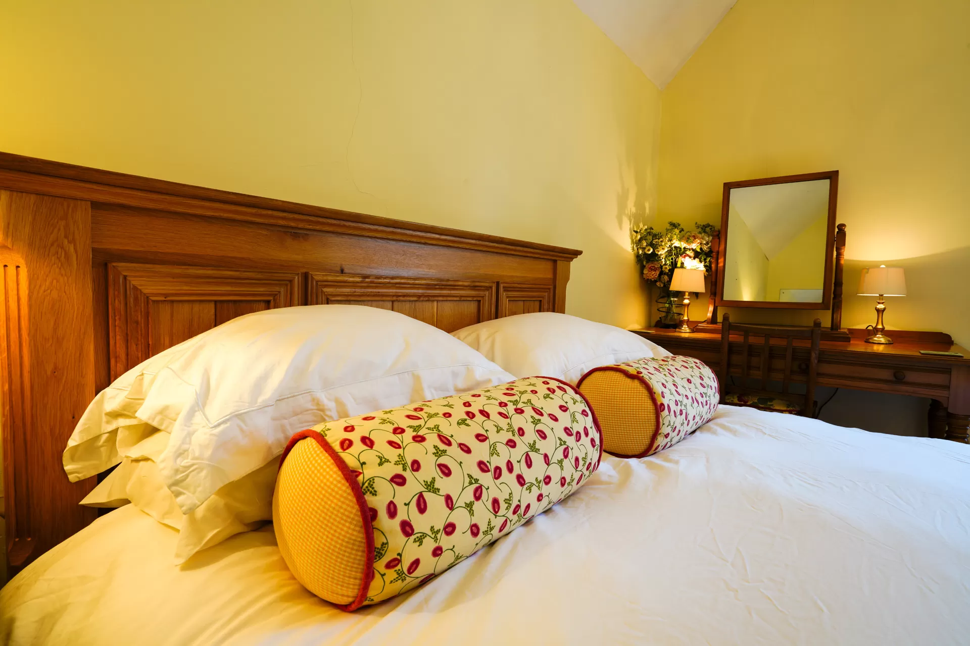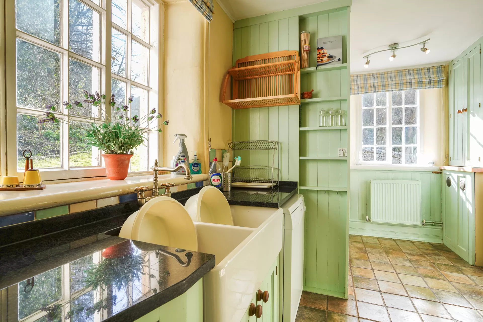 Step inside, and you immediately feel the character of this Victorian fishing lodge. The large sitting room is the undeniable heart of the cottage, its bay window framing a picture-perfect view over the river and the historic mill opposite. Here, you can sink into comfortable seating as the light fades, with the wood-burning stove casting a warm glow across the room. It is the perfect spot to plan the next day’s adventures or simply lose yourself in a good book while the sounds of the river drift through the walls.