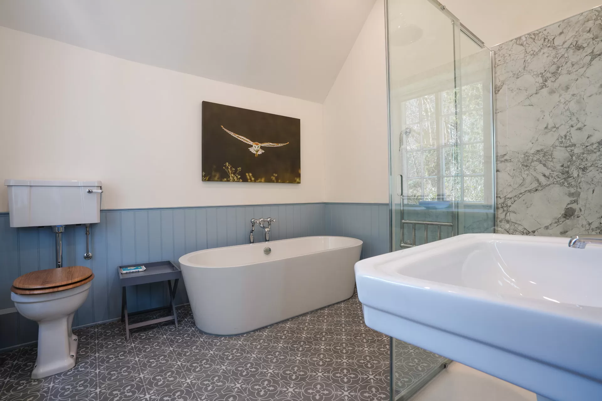 Upstairs, the accommodation offers space for everyone to retreat and recharge. The king-sized bedroom provides a serene sanctuary, while the twin bedroom is equally comfortable. Both rooms feature washbasins, adding a thoughtful touch of convenience. The luxury bathroom is a highlight, with its freestanding double-ended bath and a double walk-in shower with a rainfall head—a genuinely indulgent space to soak tired muscles after a long day on the trails. A handy second bathroom downstairs completes the layout, ideal for washing off muddy boots after a riverside ramble.